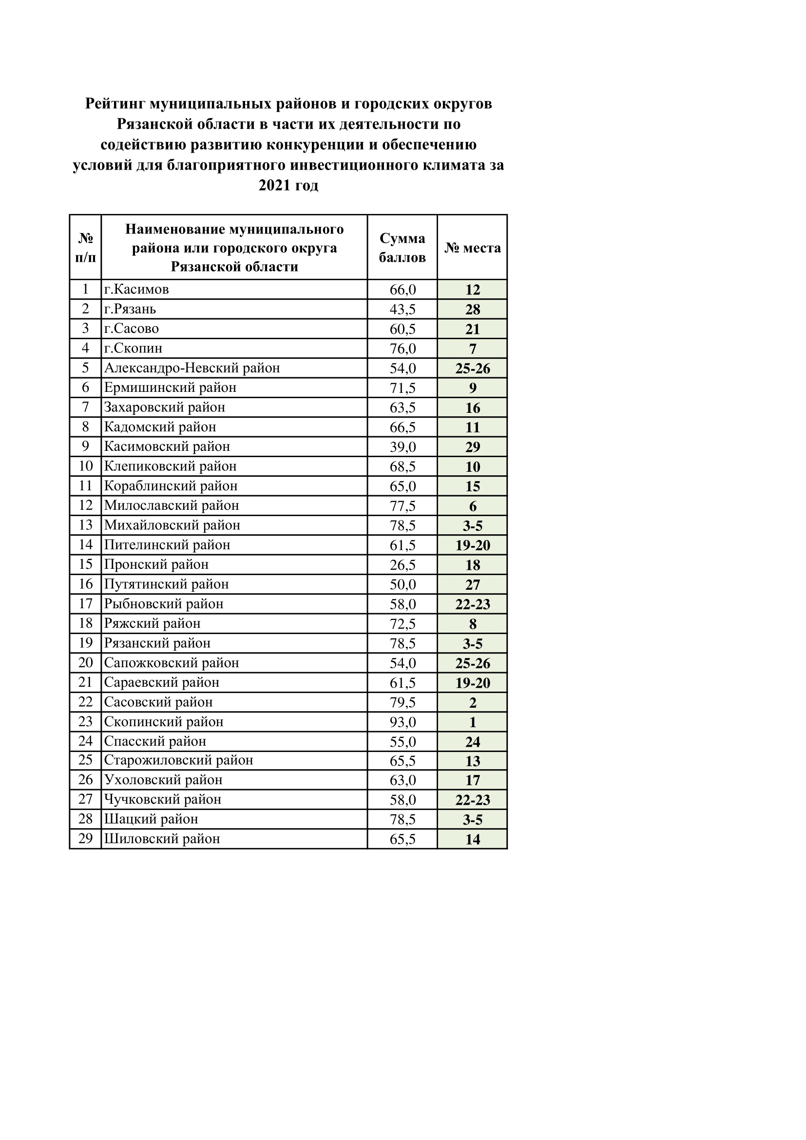 Минэкономразвития Рязанской области опубликовало результаты рейтинга муниципальных образований по содействию развитию конкуренции и обеспечению условий для благоприятного инвестиционного климата Рязанской области за 2021 год.